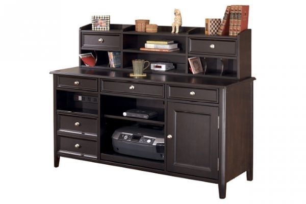 A big-time multitasker in the home office scene, the richly contemporary Carlyle credenza with short hutch has both power and presence. Credenza component includes a pull-out tray for easy equipment access, as well as a built-in power strip. With ample drawer and shelving space, it's got loads of storage potential, too. Offering dual mail cubbies, a pair of supply drawers and great display space, the added hutch is much appreciated.